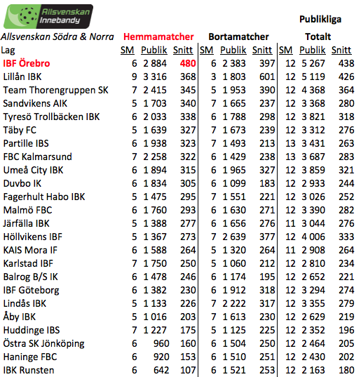 Örebro Innebandy har Sveriges bästa Allsvenska hemmapublik med en snitt på 480 supportrar! När man slår ihop de både Södra och Norra Allsvenskans publikligor, så kommer 112 fler IBF supportrar till Örebros Idrottshuset än tvåan, lokalmotståndare Lillån IBK. På tredje till femte plats över bästa hemmapublik finns Sandvikens AIK, Tyresö Trollbäcken IBK och Täby FC med 345, 340 respektive 338 personer. I Södra och Norra Allsvenskans totala publigan, är det åter Örebro Innebandy som leder med en total snitt på 438 personer, tätt följd igen av Lillån på andra platsen med 426. I platser 3-5 finns Partille, Kalmarsund och Fagerhult Habo (Jönköping) på 364, 333 respektive 321 personer. HEJA HEJA ÖREBRO! Sammanställningen av publikligan med precis över hälften av Allsvenskans 22 matcherna nu spelat, finns här: • Allsvenskan Södra (länk) • Allsvenskan Norra (länk)